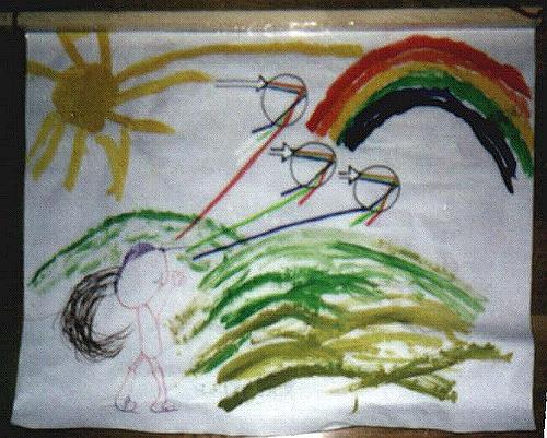It’s not enough, but I can’t let this moment pass without a little science lesson. It’s all to do with not being outdone by Gary [Stanley], who last week explained the theory of coherent light and lasers in the Family Service! So I just wanted to digress a little to explain how rainbows work. This picture was painted by my five-year-old son Joel: